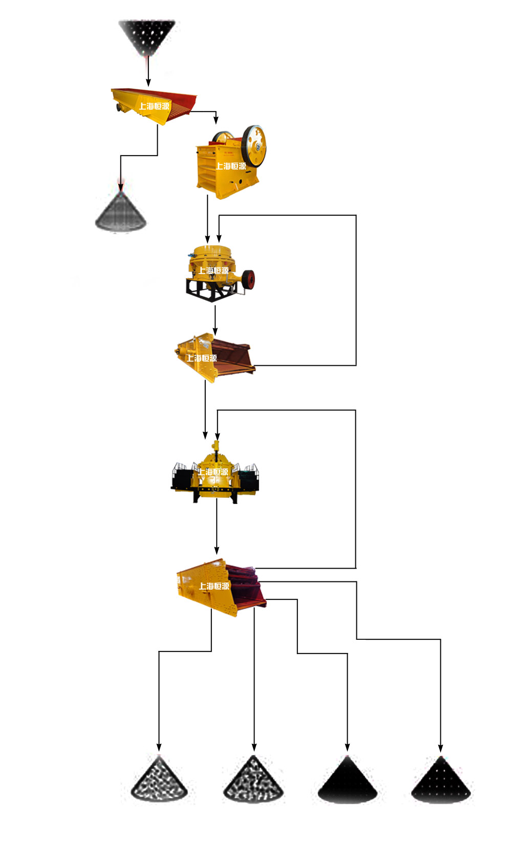 石料生产线自动化程度高;其生产效率高,运行成本低,产量大,收益高;排料粒度大小可调,破碎率高,节能;成品石子粒度均匀、粒形好,符合国家高速用料标准。